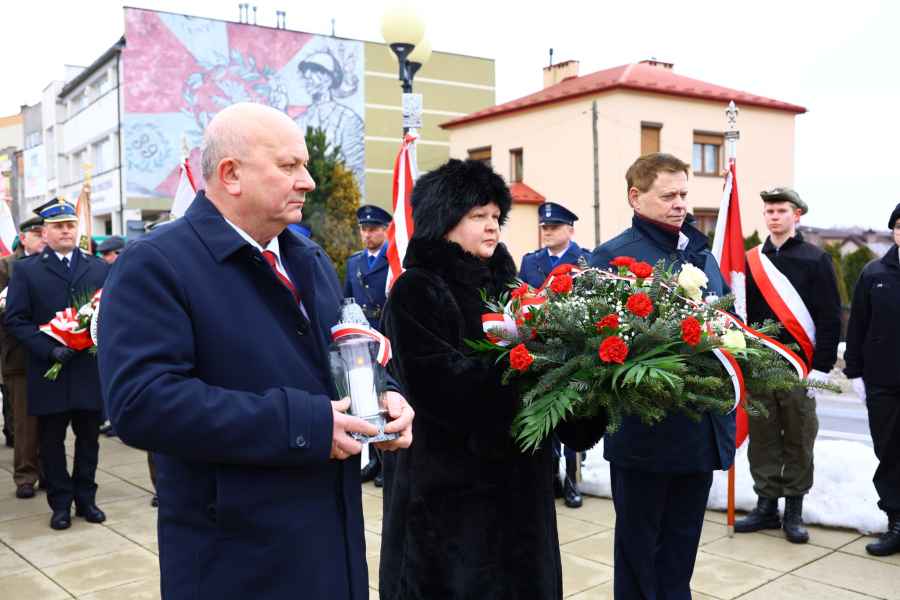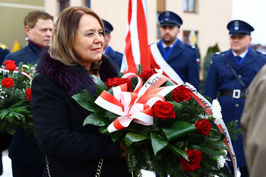 Wicestarosta Zenon Swatek, starosta Barbara Broź oraz Członek Zarządu Powiatu Józef Ozimek składają kwiaty pod pomnikiem w Lubaczowie fot. Powiat Lubaczowski