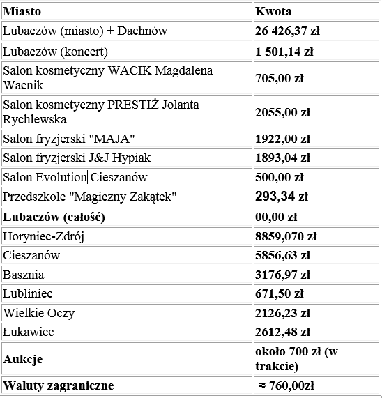 Na dzień po finale (11 stycznia) zebrana przez lubaczowski sztab kwota wynosi ponad 60 tys. zł, ale pamiętajmy, że wciąż trwają aukcje internetowe, dzięki którym suma na pewno wzrośnie. - czytamy na stronie lubaczow.powiat.pl
