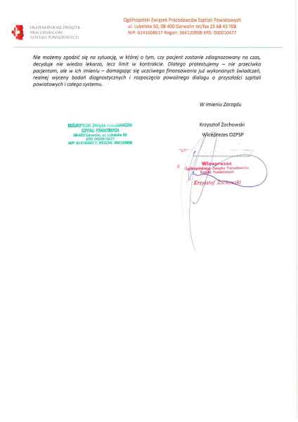 Jak zaznacza, sytuacja finansowa placówek z miesiąca na miesiąc staje się coraz trudniejsza, a niedoszacowane kontrakty i rosnące koszty powodują, że szpitale funkcjonują na granicy swoich możliwości. Podkreśla, że wykonywane świadczenia często nie są w pełni finansowane, mimo że dotyczą realnej pomocy udzielanej pacjentom. Wskazuje również, że coraz większym obciążeniem są koszty bieżącego funkcjonowania, które pochłaniają większość dostępnych środków. Bez konkretnych decyzji i zmian systemowych – jak zaznacza – szpitale powiatowe mogą być zmuszone do ograniczania działalności, co bezpośrednio przełoży się na dostępność leczenia dla mieszkańców.