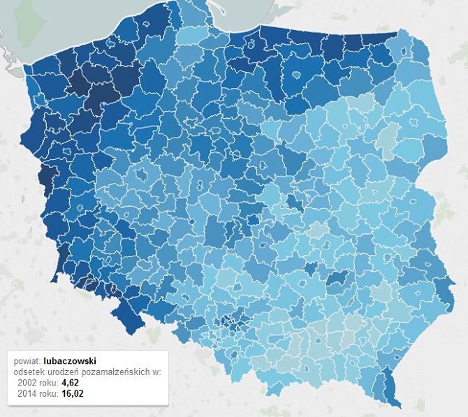 Rekordzistami są powiaty łobeski i drawski na Pomorzu Zachodnim, powiat słubicki w lubuskim oraz Wałbrzych. Tam nieślubne dzieci stanowiły w 2014 r. prawie połowę urodzeń.