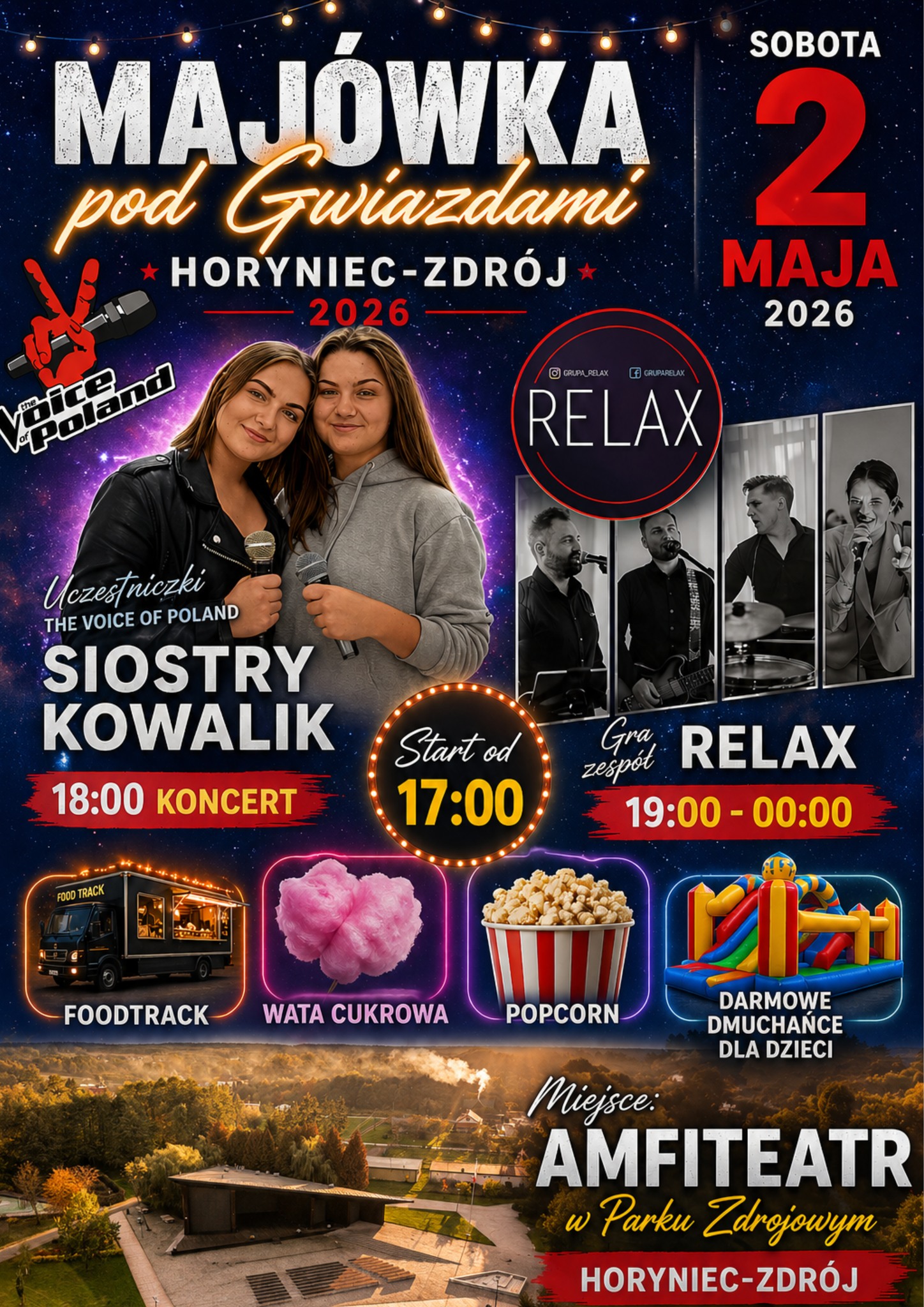 Majówkowy weekend w Horyńcu-Zdroju zapowiada się muzycznie i rodzinnie. W sobotę, 2 maja, w Amfiteatrze w Parku Zdrojowym odbędzie się „Majówka pod Gwiazdami” - plenerowe wydarzenie, które połączy koncert, taneczną zabawę i atrakcje dla najmłodszych.