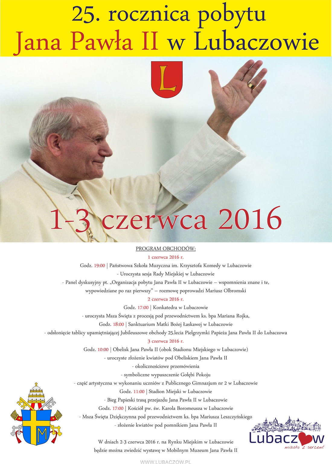 25 lat temu, 2 i 3 czerwca 1991 roku w Lubaczowie był Papież Jan Paweł II. To było wielkie wydarzenie. Tysiące ludzi ze łzami w oczach witało Ojca Świętego. Lubaczów upamiętni te niezwykłe dni uroczystościami które odbędą się w dniach 1 - 3 czerwca.