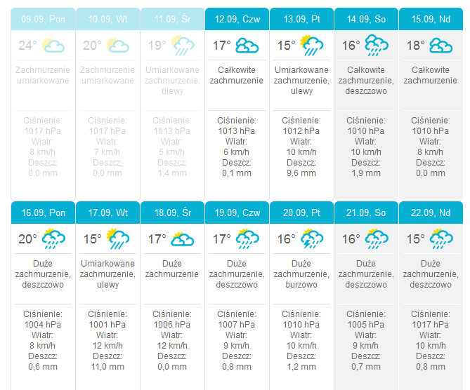 Dzisiaj rozpoczyna się jesienna aura i potrwa dobrych kilka dni. Od czwartku aż do następnej niedzieli (22.09) prognozy nie są optymistyczne. Po ciepłym lecie nadchodzi ochłodzenie. W najbliższych dniach nad naszymi głowami niebo będzie zachmurzone. Będzie często padało. Temperatura typowo jesienna - od 15 do maksymalnie 20 stopni.