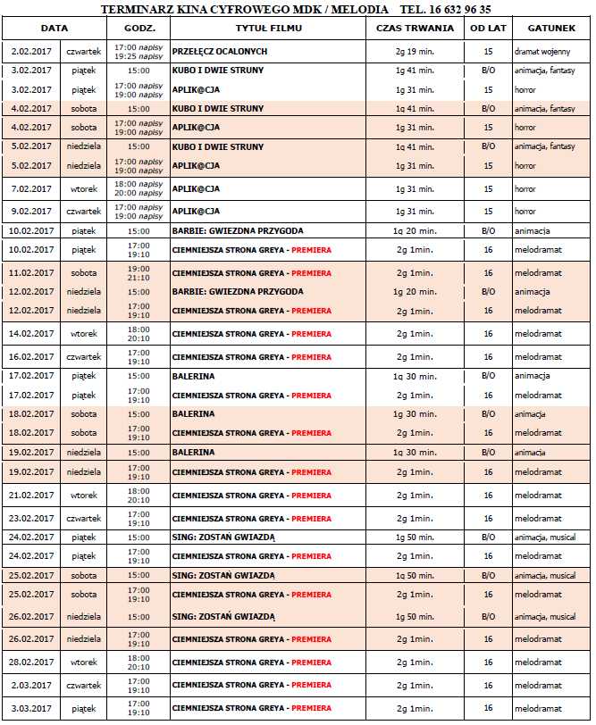 W lutym w kinie "Melodia" w Lubaczowie odtwarzane będą filmy: PRZEŁĄCZ OCALONYCH, KUBO I DWIE STRONY, APLIKA@CJA, BARBIE: GWIEZDNA PRZYGODA, premierowo CIEMNIEJSZA STRONA GREYA, BALERINA, SING: ZOSTAŃ GWIAZDĄ.