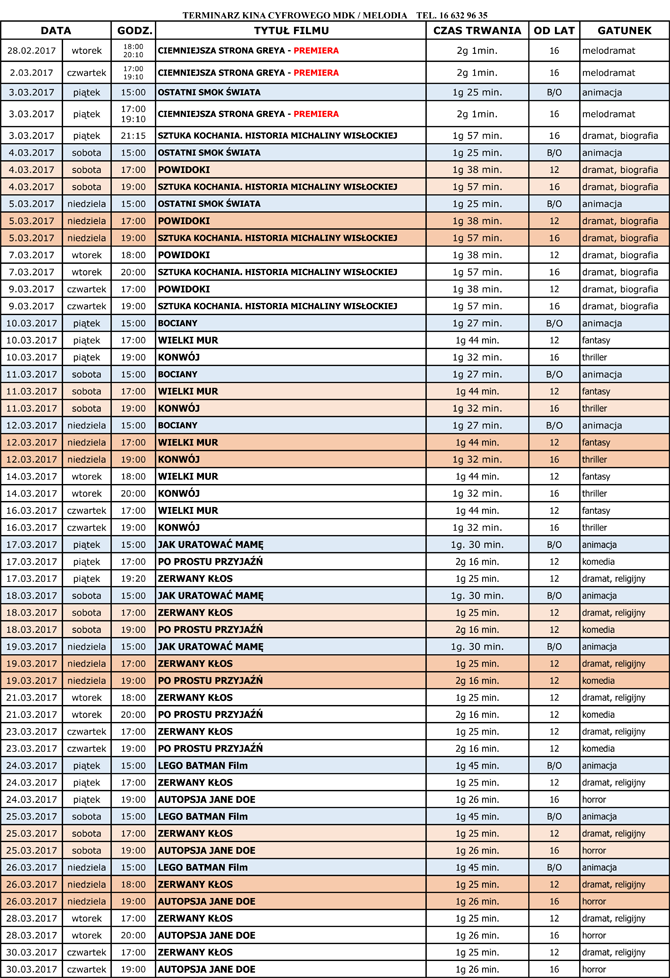 W marcu w lubaczowskim kinie "Melodia" będzie co oglądać. Będą odtwarzane filmy: Ostatni smok świata, Ciemniejsza strona Greya, Sztuka kochania. Historia Michaliny Wisłockiej, Powidoki, Bociany, Wielki mur, Konwój, Jak uratować mamę, Po prostu przyjaźn, Zerwany kłos, LEGO BATMAN Film oraz Autopsja Jane Doe.