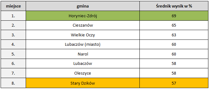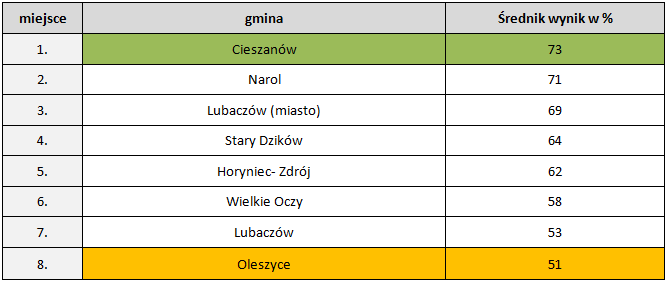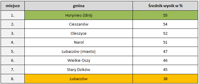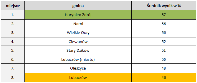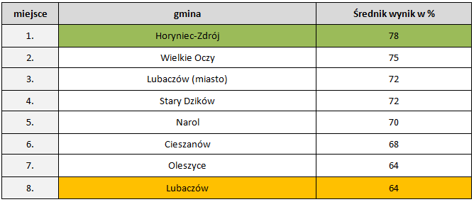 W powiecie lubaczowskim najlepszy wynik ogółem z czterech części egzaminu (język polski, historia i WOS, nauki przyrodnicze i matematyka) osiągnęli uczniowie z gminy Horyniec-Zdrój. Podobnie jak w 2016 roku w naszym powiecie najsłabsze wyniki osiągnęli gimnazjaliści z gminy Lubaczów.