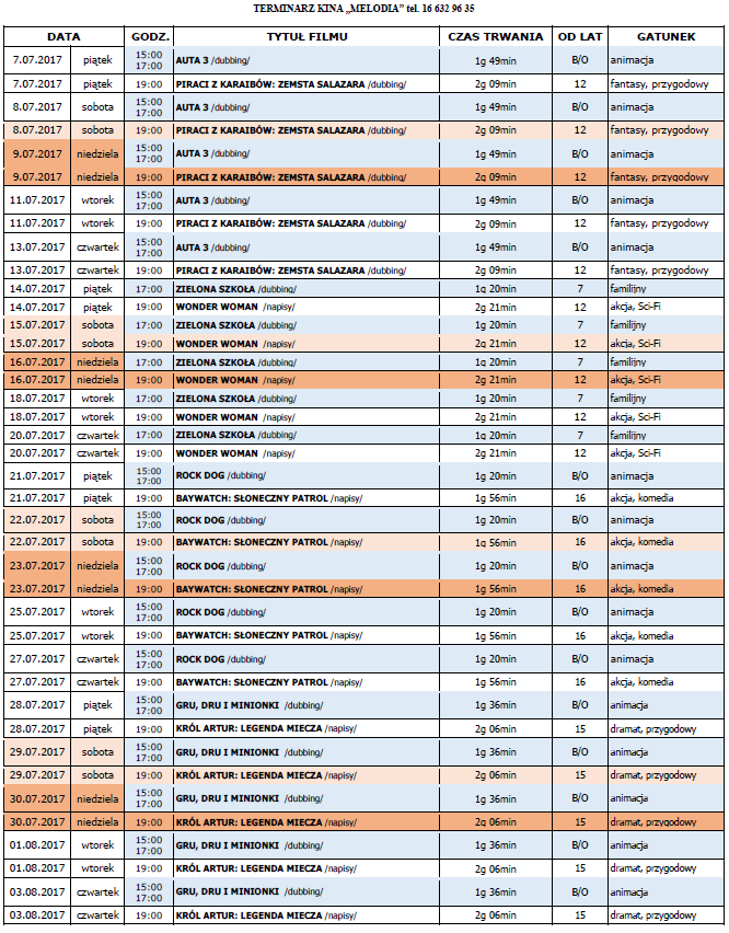 W lipcu w lubaczowskim kinie "Melodia" będzie co oglądać: Auta 3, Piraci z Karaibów: Zemsta Salazara, Zielona Szkoła, Wonder Woman, Rock Dog, Baywatch: Słoneczny Patrol, Gru, Dru i Minionki, Król Artur: Legenda Miecza.