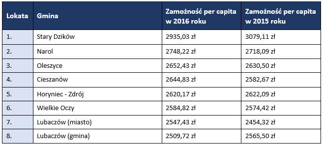 Od kilkunastu lat magazyn „Wspólnota” przygotowuje rankingi finansowe, m.in. dotyczące wydatków na inwestycje i poziomu zamożności w przeliczeniu na jednego mieszkańca. Dochody poszczególnych samorządów w roku 2016, podobnie jak w latach wcześniejszych, zostały podzielone przez liczbę mieszkańców gminy. W Polsce są tylko 43 gminy, których dochody według wskaźnika używanego w rankingu przekraczają 5000 zł na mieszkańca.
