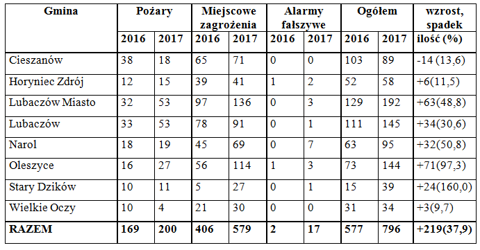 W 2017 roku na terenie powiatu lubaczowskiego straż pożarna odnotowała 796 zdarzeń. To o 219 wiecej niż w 2016 roku. W zdecydowanej większości były to tzw. miejscowe zagrożenia, czyli wyjazdy do zdarzeń drogowych, plam oleju oraz zwalczanie skutków wichur i lokalnych podtopień. Łącznie w minionym roku na terenie powiatu odnotowano 579 zagrożeń miejscowych, 200 pożarów i 17 alarmów fałszywych.