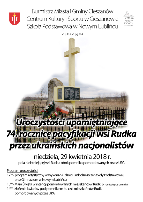 W najbliższą niedzielę (29.04) o godzinie 12:30 rozpoczną się uroczystości upamiętniające 74 rocznicę pacyfikacji wsi Rudka przez ukraińskich nacjonalistów. Uroczystości odbędą się na polach nieistniejącej wioski przy pomniku.