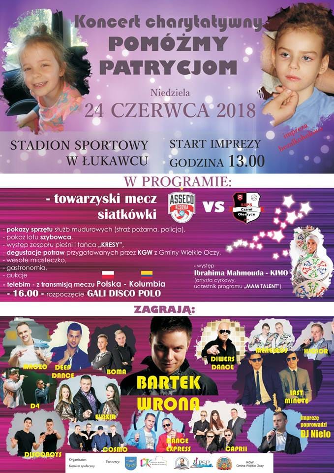 W niedzielę (24.06) na Stadionie Sportowym w Łukawcu odbędzie się koncert charytatywny "Pomóżmy Patrycjom". Na scenie pojawi się m.in. kilkunastu wykonawców muzyki disco polo, a także zostanie rozegrany mecz siatkówki Asseco Resovia Rzeszów - Czarni Oleszyce. Jednak to nie wszystko!