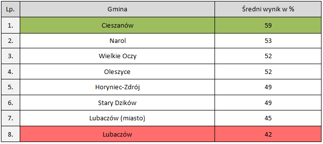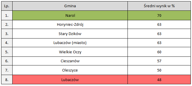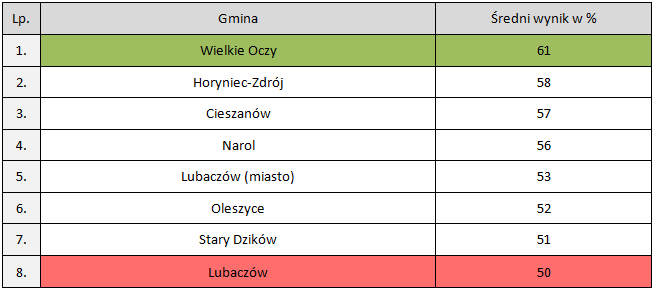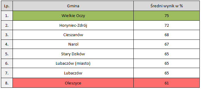 W powiecie lubaczowskim najlepszy wynik ogółem z czterech części egzaminu (język polski, historia i WOS, nauki przyrodnicze i matematyka) osiągnęli uczniowie z gminy Horyniec-Zdrój i Wielkie Oczy. Podobnie jak w 2016 roku w naszym powiecie najsłabsze wyniki osiągnęli gimnazjaliści z gminy Lubaczów i Oleszyce.