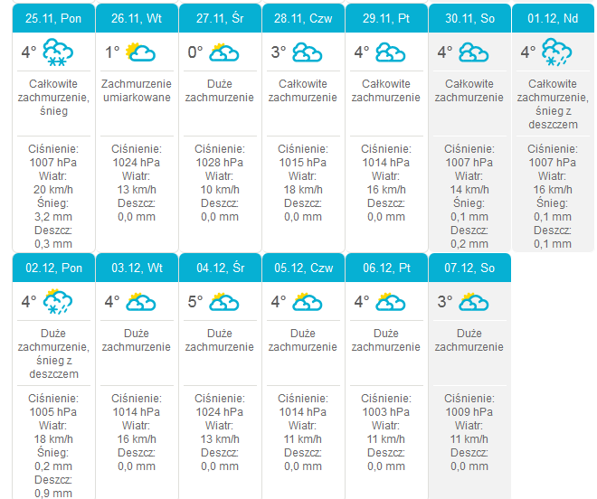 Kończy się listopad, a jeszcze nie widzieliśmy śniegu pomimo tego, że blisko już kalendarzowej zimy. Jednych to cieszy, drudzy martwią się że Święty Mikołaj tym razem nie będzie mógł przyjechać na swoich saniach. Zobaczmy prognozę pogody dla naszych terenów.