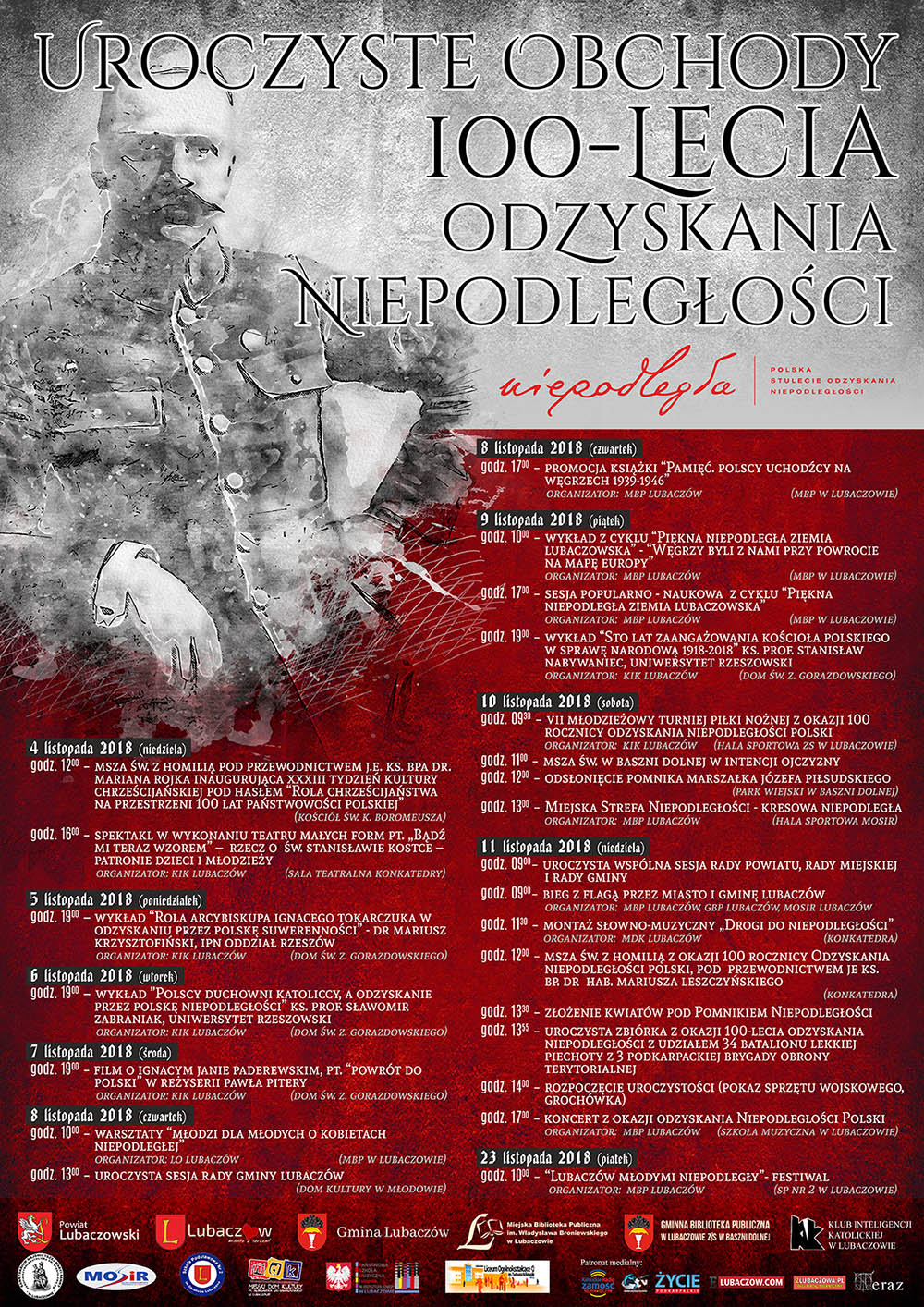W związku z rocznicą 100-lecia odzyskania niepodległości przez Polskę zapraszamy wszystkich mieszkańców Lubaczowa na uroczyste obchody tego wzniosłego i niezwykle ważnego wydarzenia w historii naszego kraju. Podczas dorocznych obchodów 11 listopada uczcimy pamięć tych, którym zawdzięczamy własne państwo, którym udało się podnieść kraj z ogromnych zniszczeń I wojny światowej, stworzyć warunki rozwoju ekonomicznego, modernizacji gospodarczej i cywilizacyjnej. – zaprasza Miejska Biblioteka Publiczna w Lubaczowie