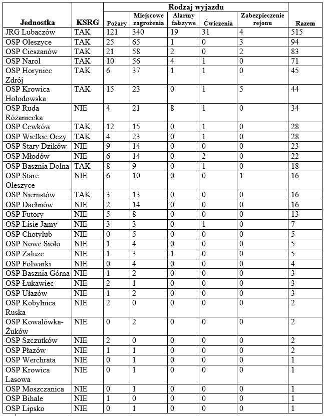Najaktywniejszą ochotniczą jednostką wśród ochotników była OSP Oleszyce. Druhowie tej jednostki zaliczyli 94 wyjazdów. O 11 zdarzeń mniej odnotowała Ochotnicza Straż Pożarna z Cieszanowa, natomiast 71 razy do akcji ruszali strażacy OSP Narol. Zawodowi ratownicy uczestniczyli w 515 akcjach.