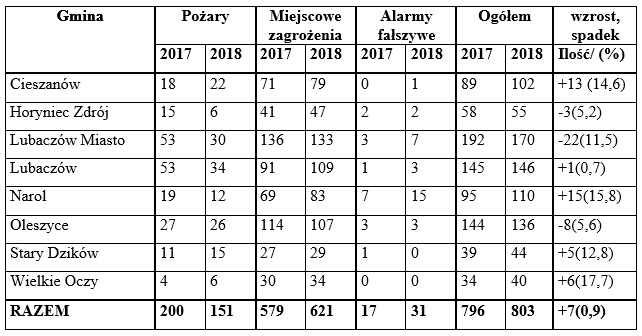 W 2018 roku na terenie powiatu lubaczowskiego straż pożarna odnotowała 803 zdarzeń. To o 6 więcej niż w 2017 roku. W zdecydowanej większości były to tzw. miejscowe zagrożenia, czyli wyjazdy do zdarzeń drogowych, plam oleju oraz zwalczanie skutków wichur i lokalnych podtopień. Łącznie w minionym roku na terenie powiatu odnotowano 621 zagrożeń miejscowych, 151 pożarów i 31 alarmów fałszywych.