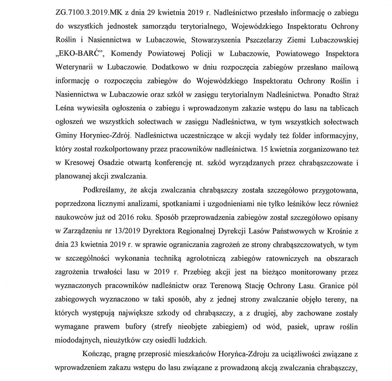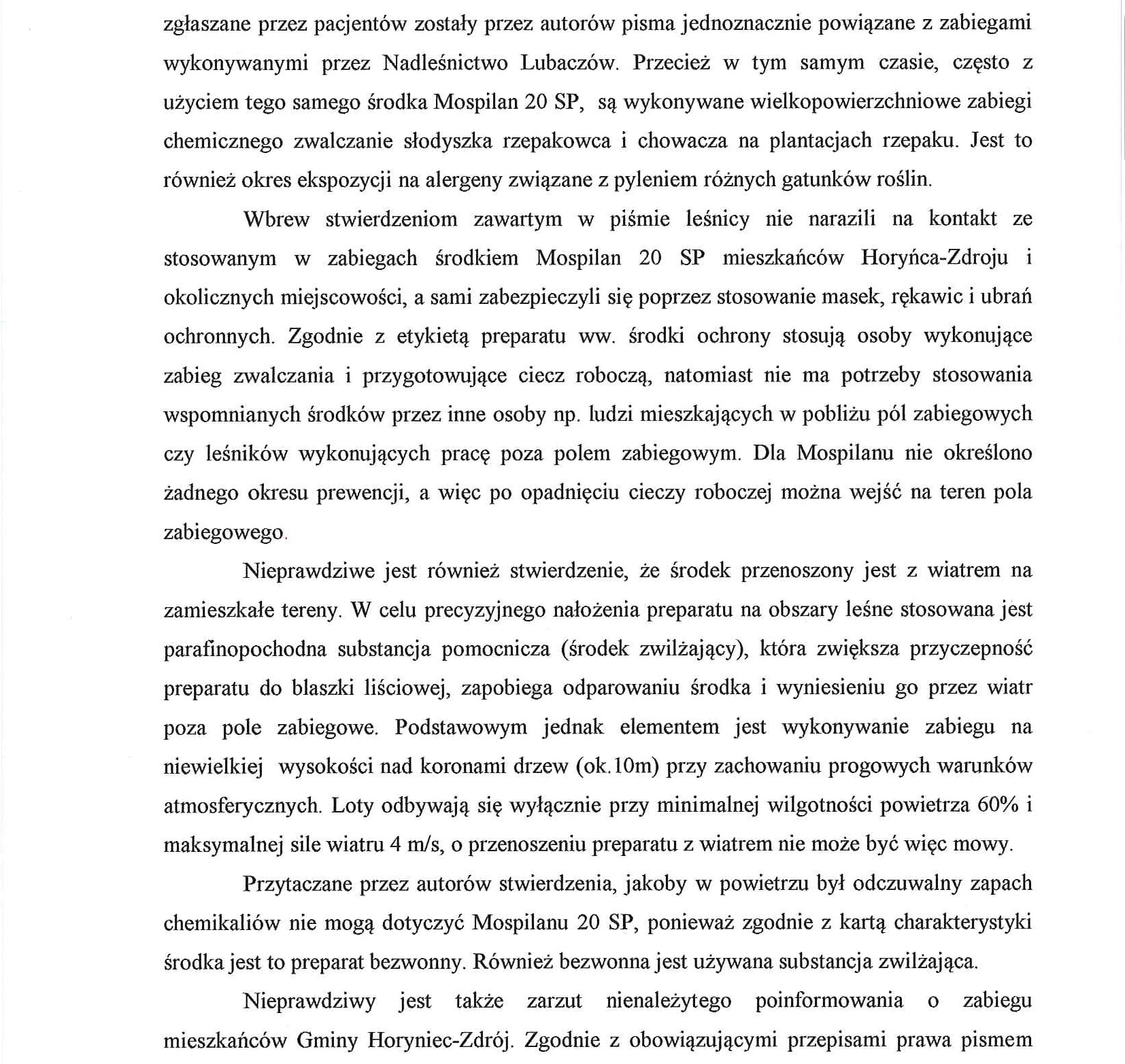 Nadleśniczy Nadleśnictwa Lubaczów Robert Banaś wystosował komunikat w sprawie prowadzonych zabiegów agrolotniczych, w którym zaprzecza jakoby leśnicy narazili na kontakt ze stosowanym w zabiegach środkiem Mosipilan 20 SP mieszkańców Horyńca-Zdroju i okolicznych miejscowości.