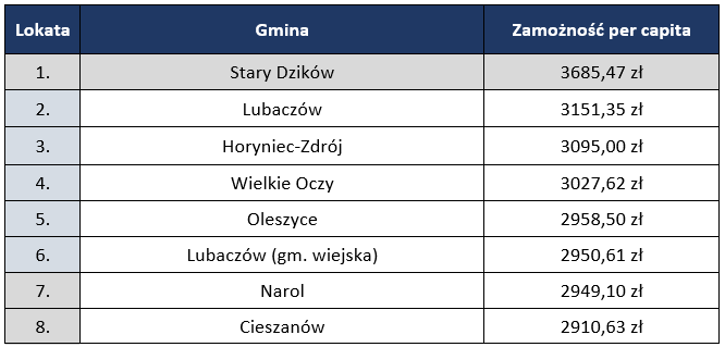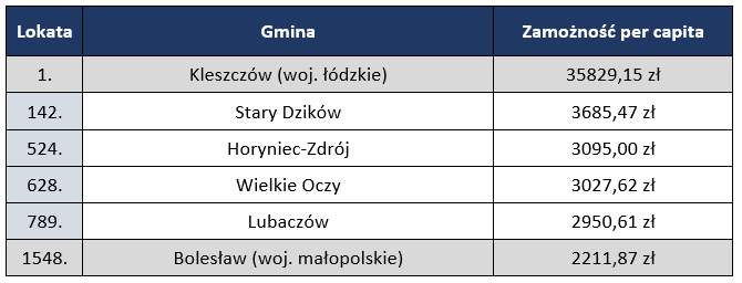 Od kilkunastu lat magazyn „Wspólnota” przygotowuje rankingi finansowe, m.in. dotyczące wydatków na inwestycje i poziomu zamożności w przeliczeniu na jednego mieszkańca. Dochody poszczególnych samorządów w roku 2018, podobnie jak w latach wcześniejszych, zostały podzielone przez liczbę mieszkańców gminy.