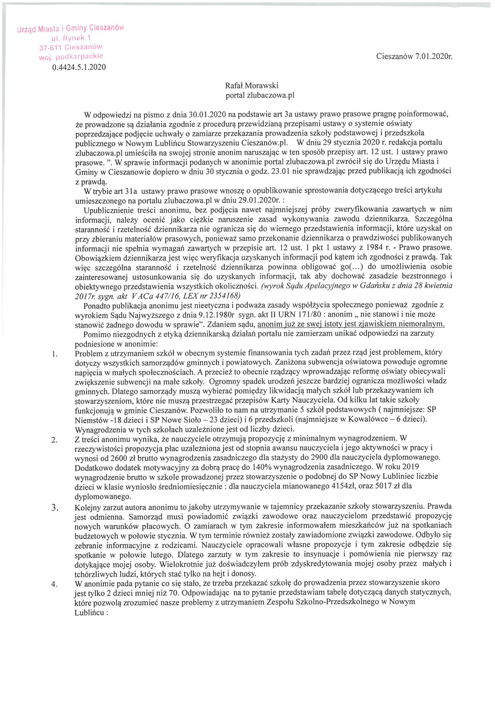 - "Prawda jest odmienna. [...]. O zamiarach informowałem mieszkańców już na spotkaniach budżetowych w połowie stycznia. W tym terminie również zostały zawiadomione związki zawodowe. Odbyło się zebranie informacyjne z rodzicami. Nauczyciele opracowali własne propozycje i w tym zakresie odbędzie się spotkanie w połowie lutego" - czytamy w piśmie od UG przesłanym do redakcji portalu ZLUBACZOWA.PL