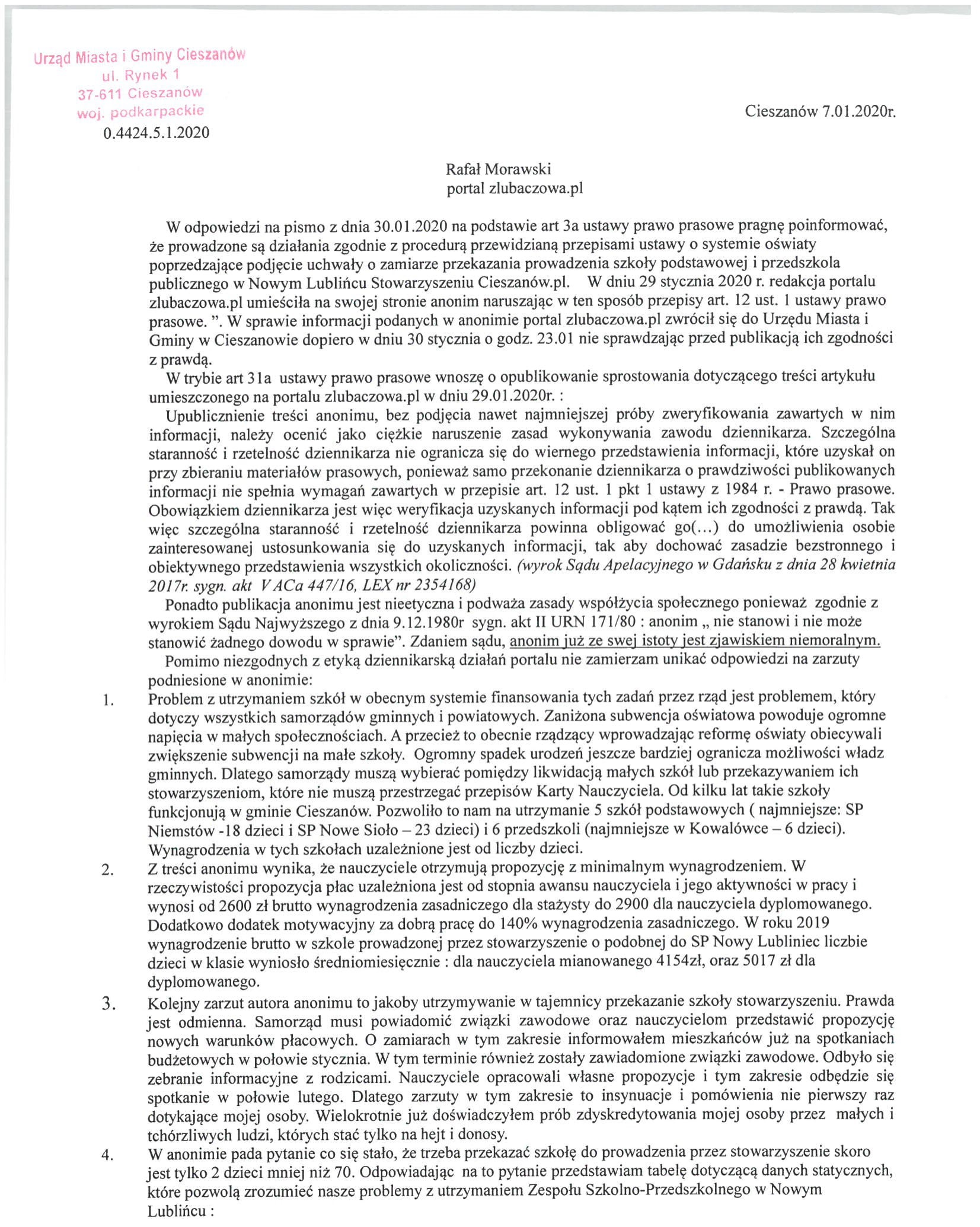 Pełną treść pisma stanowiącego odpowiedź na nasze pytanie dot. szkoły w Nowym Lublińcu prezentujemy poniżej: