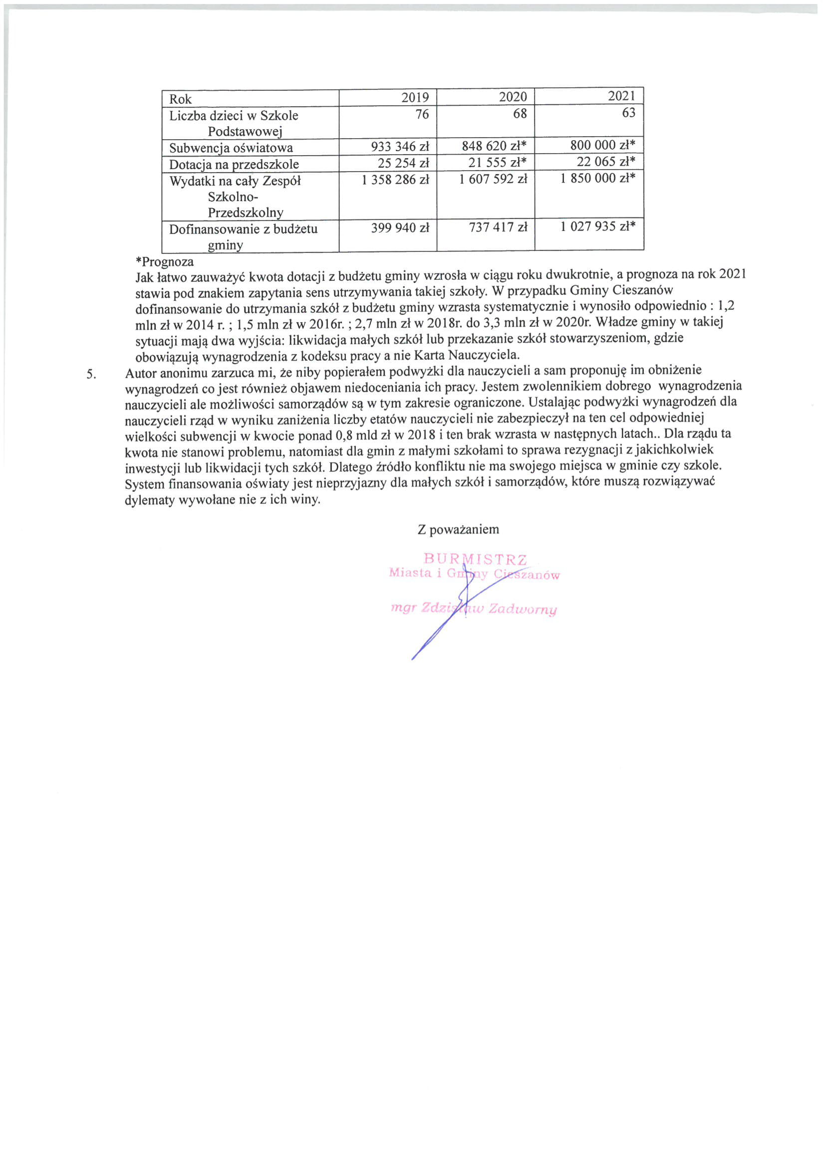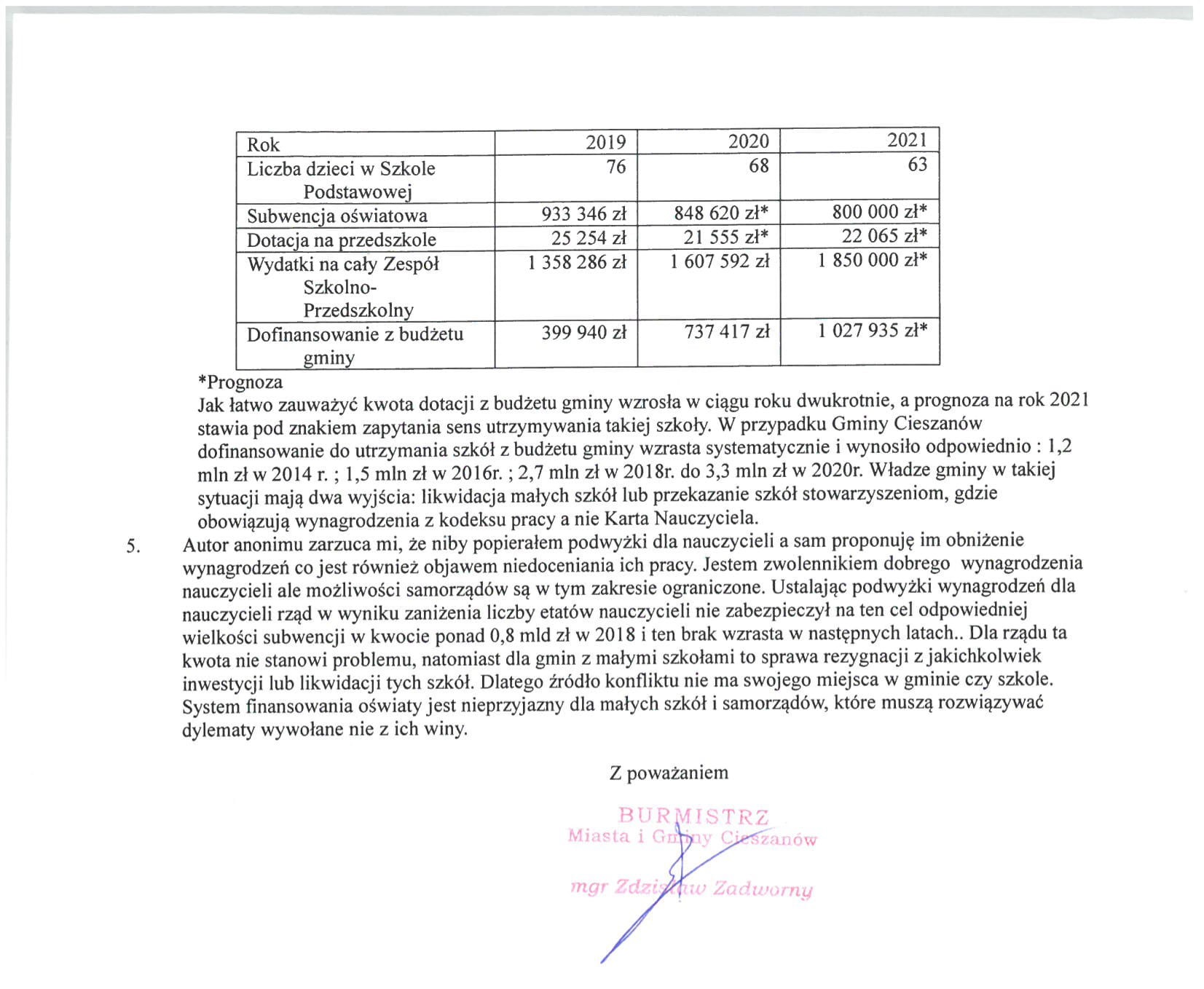 W odpowiedzi na pytanie anonima, w pierwszej kolejności Zdzisław Zadworny zarzuca, że problemy z utrzymaniem szkół wynikają z zaniżonej subwencji oświatowej. Twierdzi również, że obecnie rządzący wprowadzając reformę obiecywali zwiększenie dofinansowań na małe szkoły.