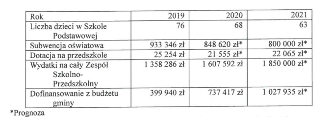 - „Jak łatwo zauważyć kwota dotacji z budżetu gminy wzrosła w ciągu roku dwukrotnie, a prognoza na rok 2021 stawia pod znakiem zapytania sens utrzymywania takiej szkoły. W przypadku Gminy Cieszanów dofinansowania do utrzymania szkół z budżetu gminy wzrasta systematycznie i wynosiła odpowiednio: 1,2 mln złotych w 2014 r.; 1,5 mln złotych w 2016 r.; 2,7 mln złotych w 2018 r.; 3,3 mln złotych w 2020 roku. Władze gminy w takiej sytuacji mają dwa wyjścia: likwidacja małych szkół lub przekazanie szkół stowarzyszeniom, gdzie obowiązują wynagrodzenia z kodeksu pracy, a nie Karta Nauczyciela.” – informuje burmistrz