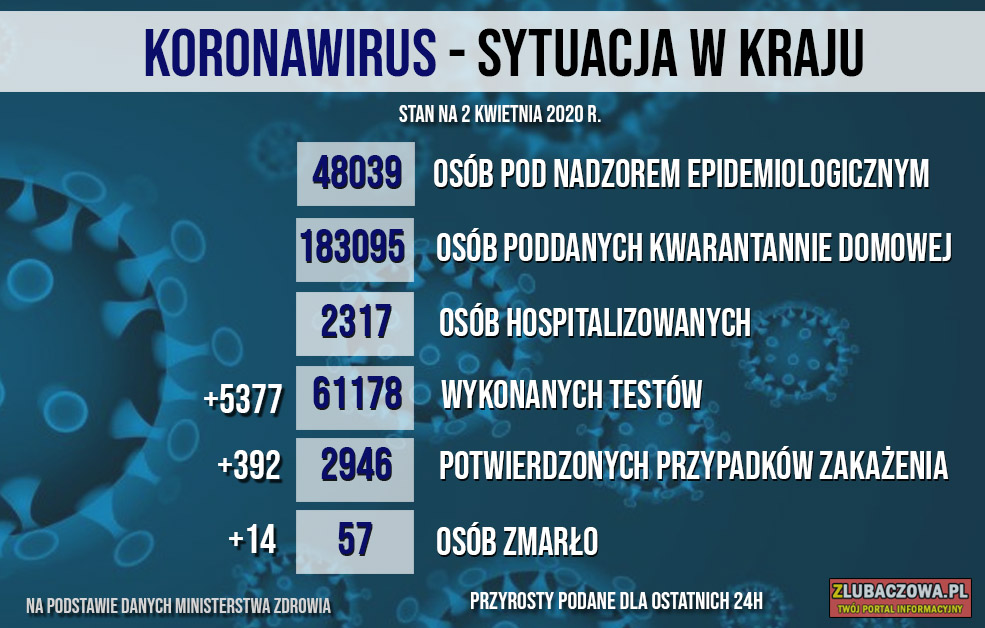 W sumie na chwilę obecną stwierdzono zakażenie u 2946 osób, z czego 57 zmarło.