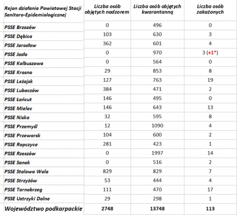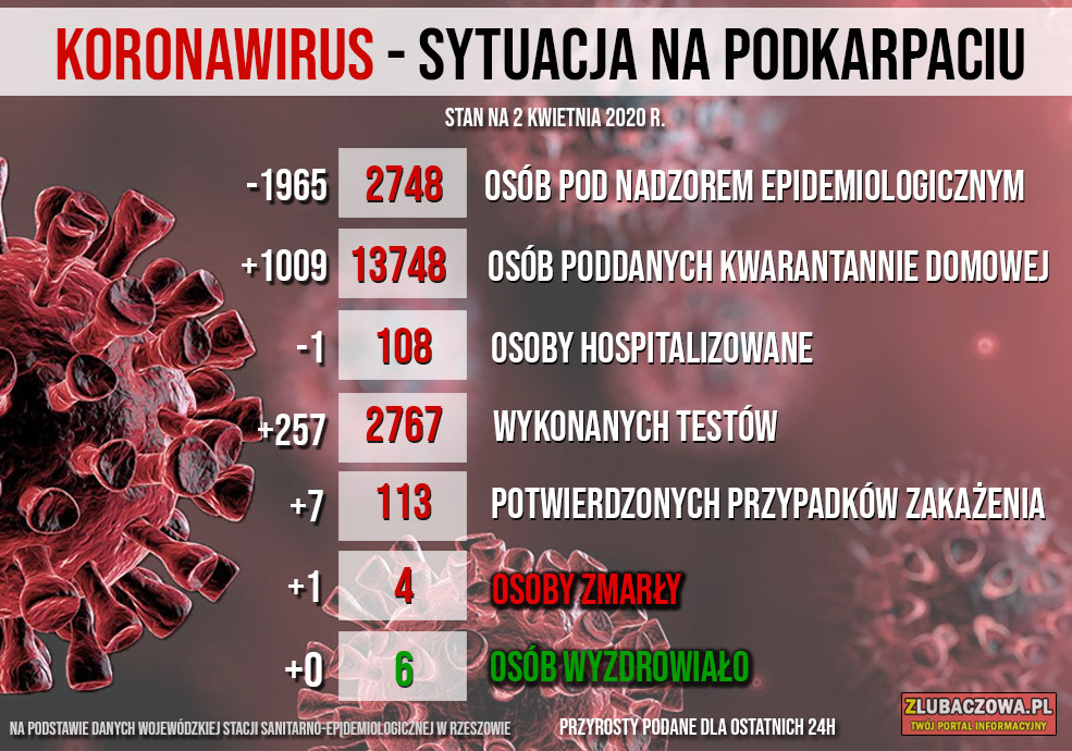 Według danych Wojewódzkiej Stacji Sanitarno-Epidemiologicznej w Rzeszowie na dzień dzisiejszy (02.04) 384 osoby objęte jest nadzorem epidemiologicznym (spadek o 153) natomiast 471 jest poddanych kwarantannie domowej (spadek o 25). Do tej pory stwierdzono 2 przypadki zakażenia - u młodej kobiety z gminy Stary Dzików oraz mężczyzny w średnim w wieku z gminy Wielkie Oczy. Niestety zakażona 32-letnia kobieta z gminy Stary Dzików zmarła w poniedziałek w szpitalu w Łańcucie.