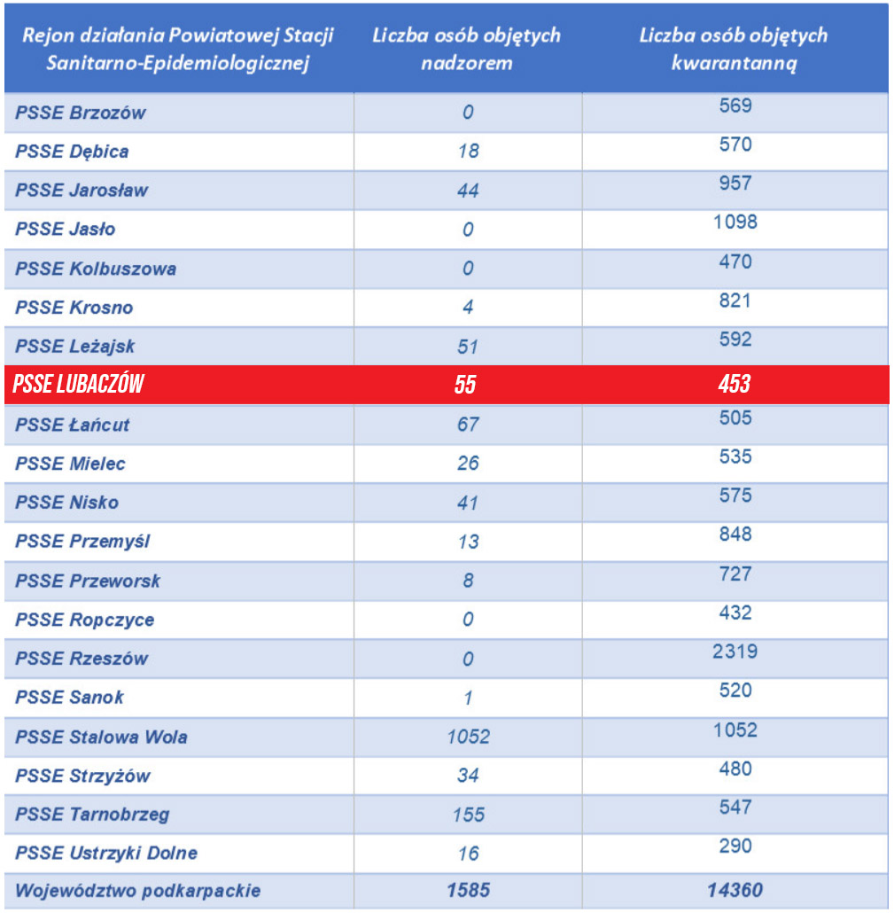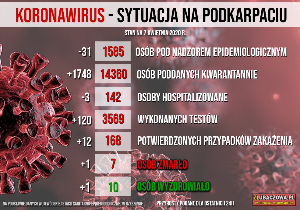 Według danych Wojewódzkiej Stacji Sanitarno-Epidemiologicznej w Rzeszowie na dzień dzisiejszy (07.04) 55 osób objętych jest nadzorem epidemiologicznym (bez zmian w stosunku do dnia wczorajszego) natomiast 453 jest poddanych kwarantannie domowej (wzrost o 66). Do tej pory stwierdzono 2 przypadki zakażenia - u młodej kobiety z gminy Stary Dzików oraz mężczyzny w średnim w wieku z gminy Wielkie Oczy. Niestety zakażona 32-letnia kobieta z gminy Stary Dzików zmarła w poniedziałek w szpitalu w Łańcucie.