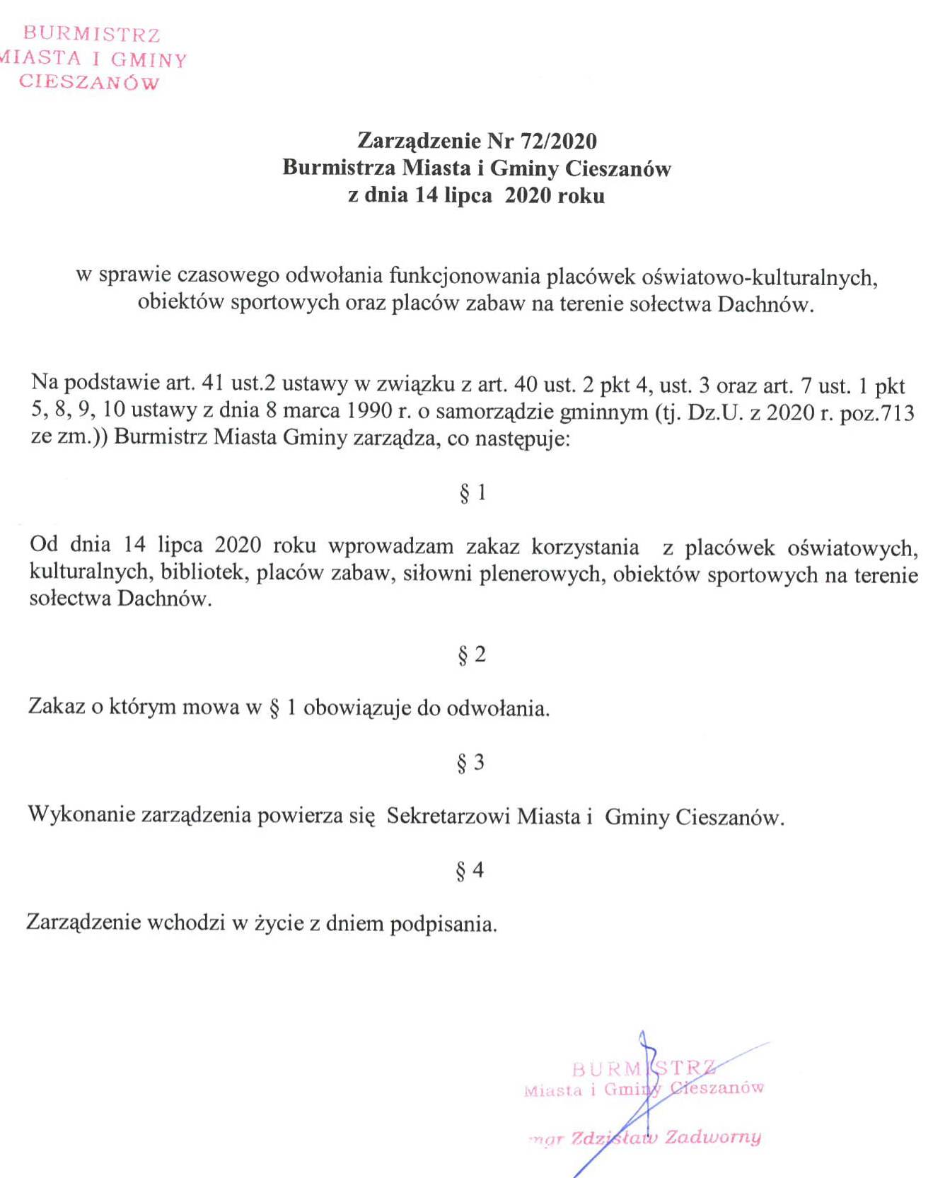 Burmistrz Cieszanowa Zdzisław Zadworny podjął decyzję o czasowym odwołaniu funkcjonowania placówek oświatowo-kulturalnych, obiektów sportowych oraz placów zabaw na terenie sołectwa Dachnów.
