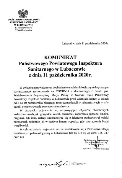 W niedzielę 11 października Państwowy Inspektor Sanitarny w Lubaczowie wydał komunikat skierowany do osób, które w dniach od 6 do 10 października bieżącego roku uczestniczyły w nabożeństwach w kościele pw. Wniebowzięcia Najświętszej Maryi Panny w Nowym Siole o obserwowanie swojego stanu zdrowia.