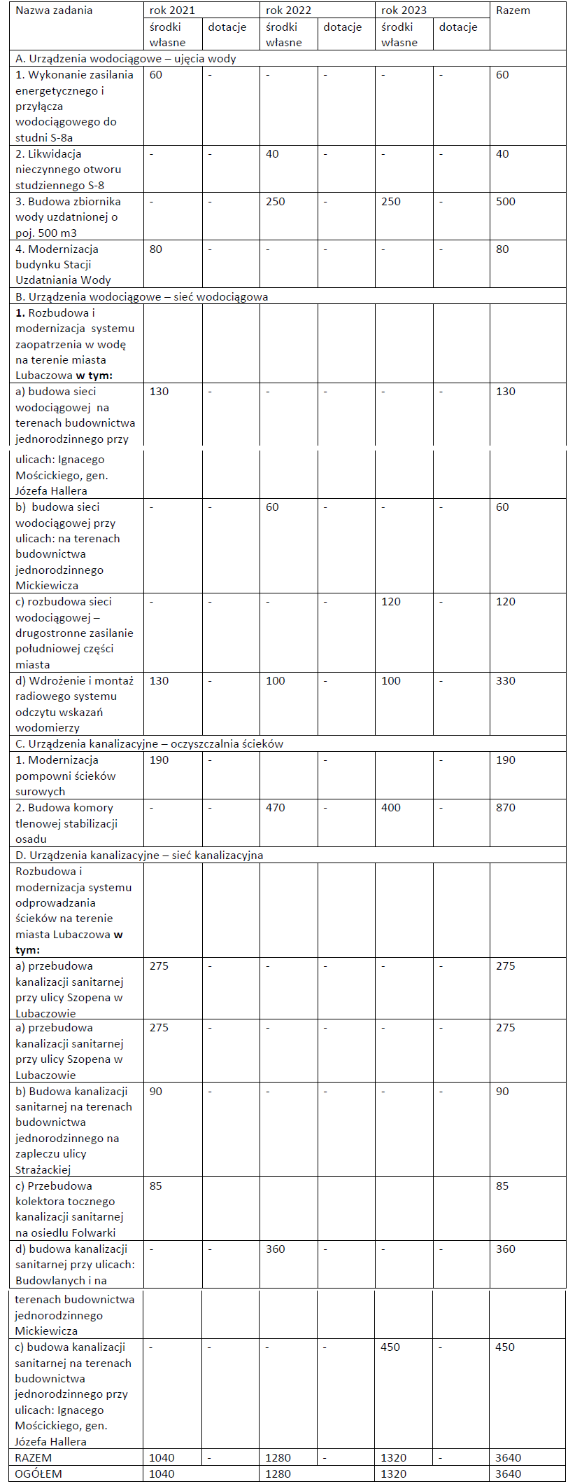 Łączna planowana wielkość nakładów inwestycyjnych na urządzenia wodociągowe i kanalizacyjne na lata 2021 – 2023 wynosi 3 640 000 zł