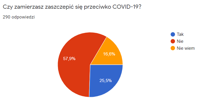 Na pytanie "Czy zaszczepisz się przeciwko COVID-19" 168 osób odpowiedziało NIE, co stanowi 57,9% wszystkich głosów.