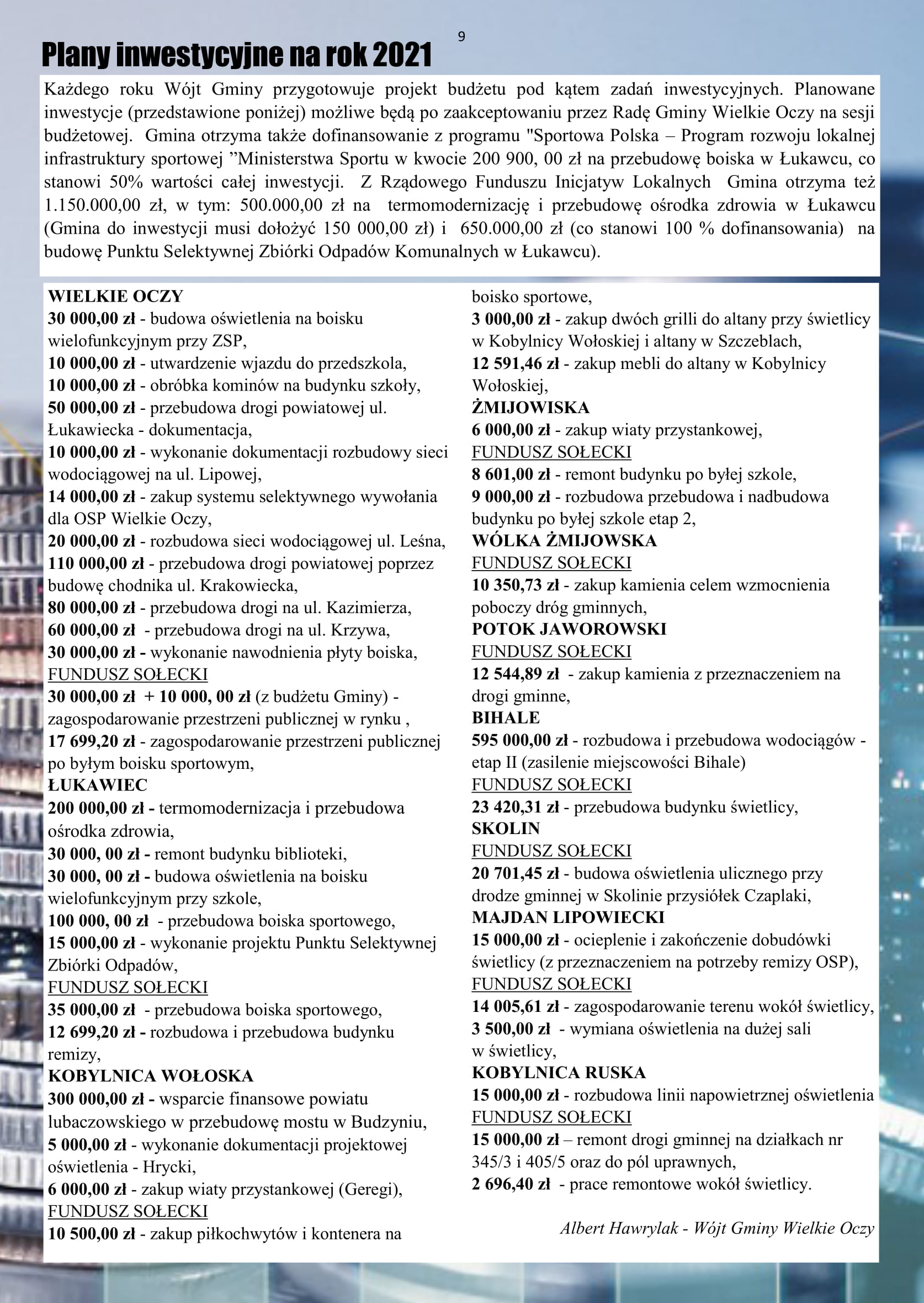 „Dziękuję za przyjęcie uchwały budżetowej oraz wszystkim, którzy pracowali nad przygotowaniem budżetu. Dzięki temu w 2021 roku będzie możliwa realizacja wielu niezbędnych przedsięwzięć na terenie całej gminy. Dołożymy wszelkich starań, aby ten budżet pozytywnie zrealizować” – mówił w trakcie sesji Wójt Gminy Wielkie Oczy Albert Hawrylak.