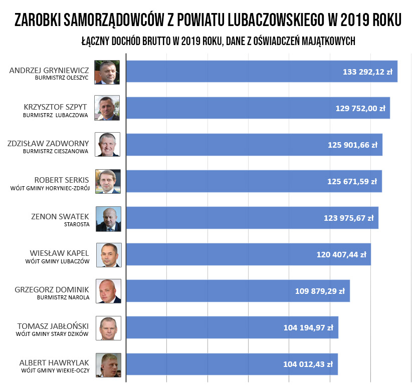 Rok 2019 największy dochód przyniósł burmistrzowi Oleszyc, który zarobił ponad 133 tys. złotych brutto. W naszym rankingu tuż za nim znalazł się burmistrz Lubaczowa którzy otrzymał prawie 130 tys. zł wynagrodzenia. Trzecie miejsce zajmuje Zdzisław Zadworny. Burmistrz Cieszanowa wypracował niespełna 126 tys. zł. Listę zamyka wójt gminy Wielkie Oczy Albert Hawrylak, który zarobił 104 tys. złotych.