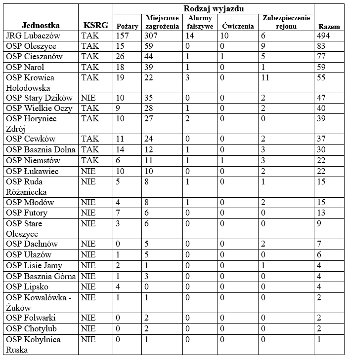 Najaktywniejszą ochotniczą jednostką wśród ochotników była OSP Oleszyce. Druhowie tej jednostki zaliczyli 83 wyjazdy. O 6 zdarzeń mniej odnotowała Ochotnicza Straż Pożarna z Cieszanowa, natomiast 59 razy do akcji ruszali strażacy OSP Nnarol.