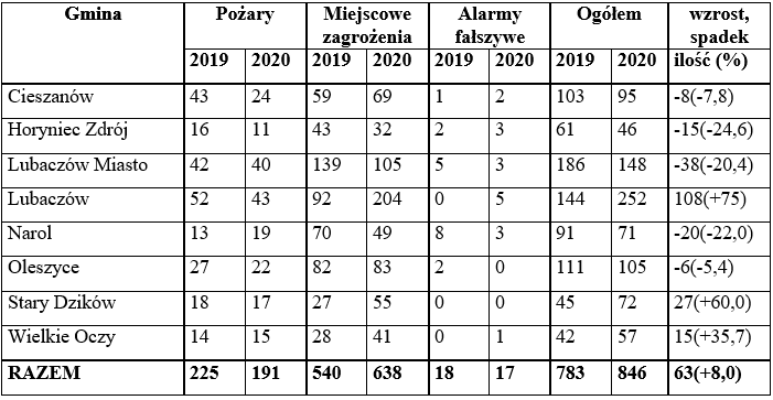 W 2020 roku na terenie powiatu lubaczowskiego straż pożarna odnotowała 846 zdarzeń. To o 63 więcej niż w 2019 roku. W zdecydowanej większości były to tzw. miejscowe zagrożenia, czyli wyjazdy do zdarzeń drogowych oraz np. zwalczanie skutków wichur i lokalnych podtopień. Łącznie w minionym roku na terenie powiatu odnotowano 638 zagrożeń miejscowych, 191 pożarów i 17 alarmów fałszywych.