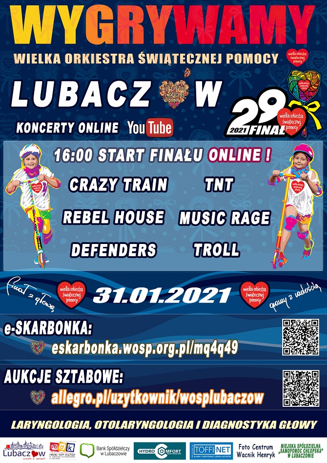 28 finał WOŚP w Lubaczowie rozpocznie się o godzinie 16:00. Tym razem wydarzenie będzie w internecie. Zagrają: Crazy Train, TNT, Rebel House, Music Rage, Defenders, Troll.