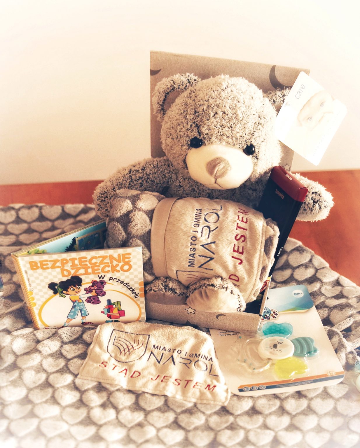 Narolska wyprawka zawiera kocyk opatrzony logo Miasta i Gminy Narol, pluszowego misia, książeczkę i grzechotkę.