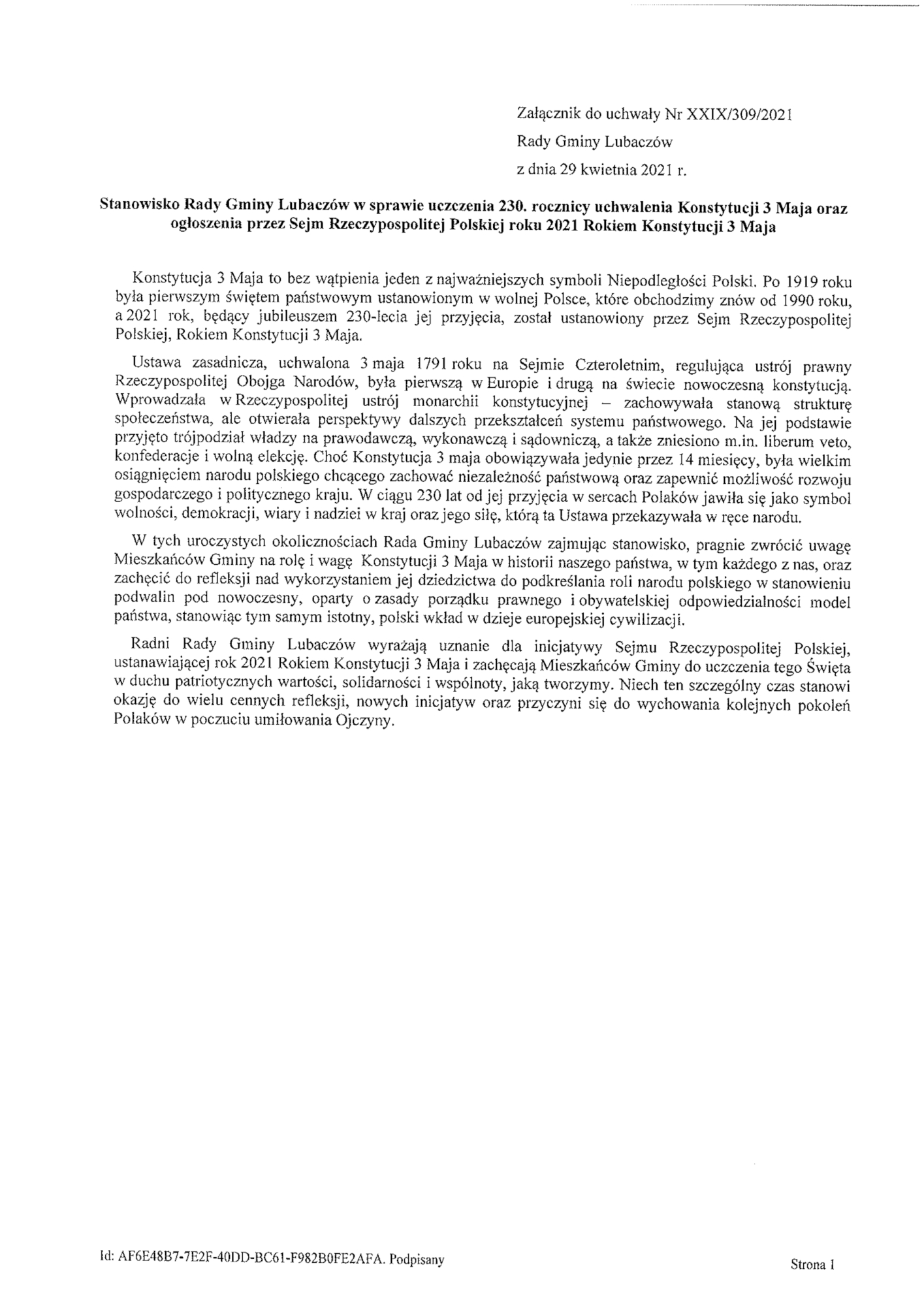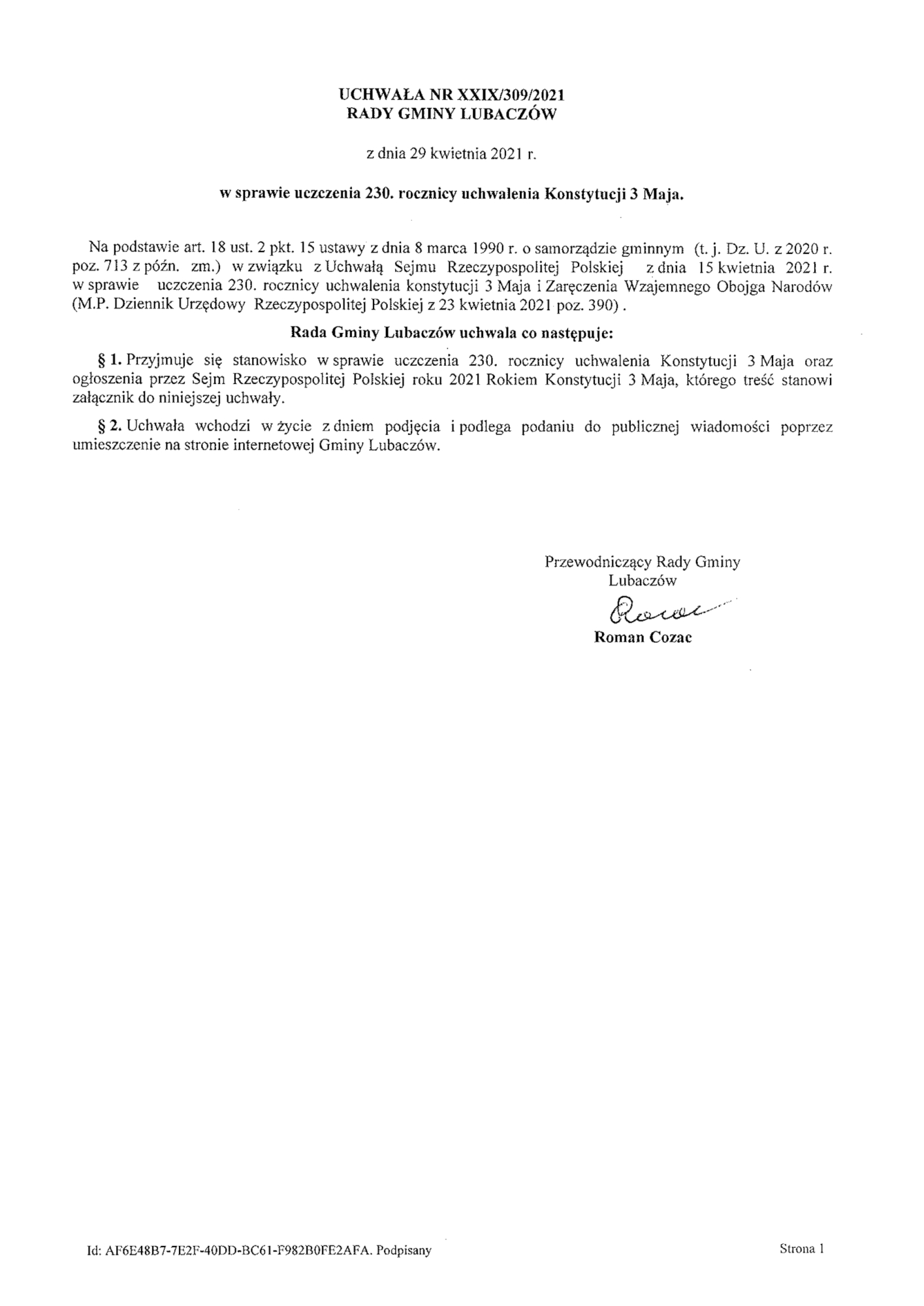 Rada Gminy Lubaczów na Sesji 29 kwietnia br. przyjęła uchwałę w sprawie uczczenia 230. rocznicy uchwalenia Konstytucji 3 Maja. Poniżej treść: