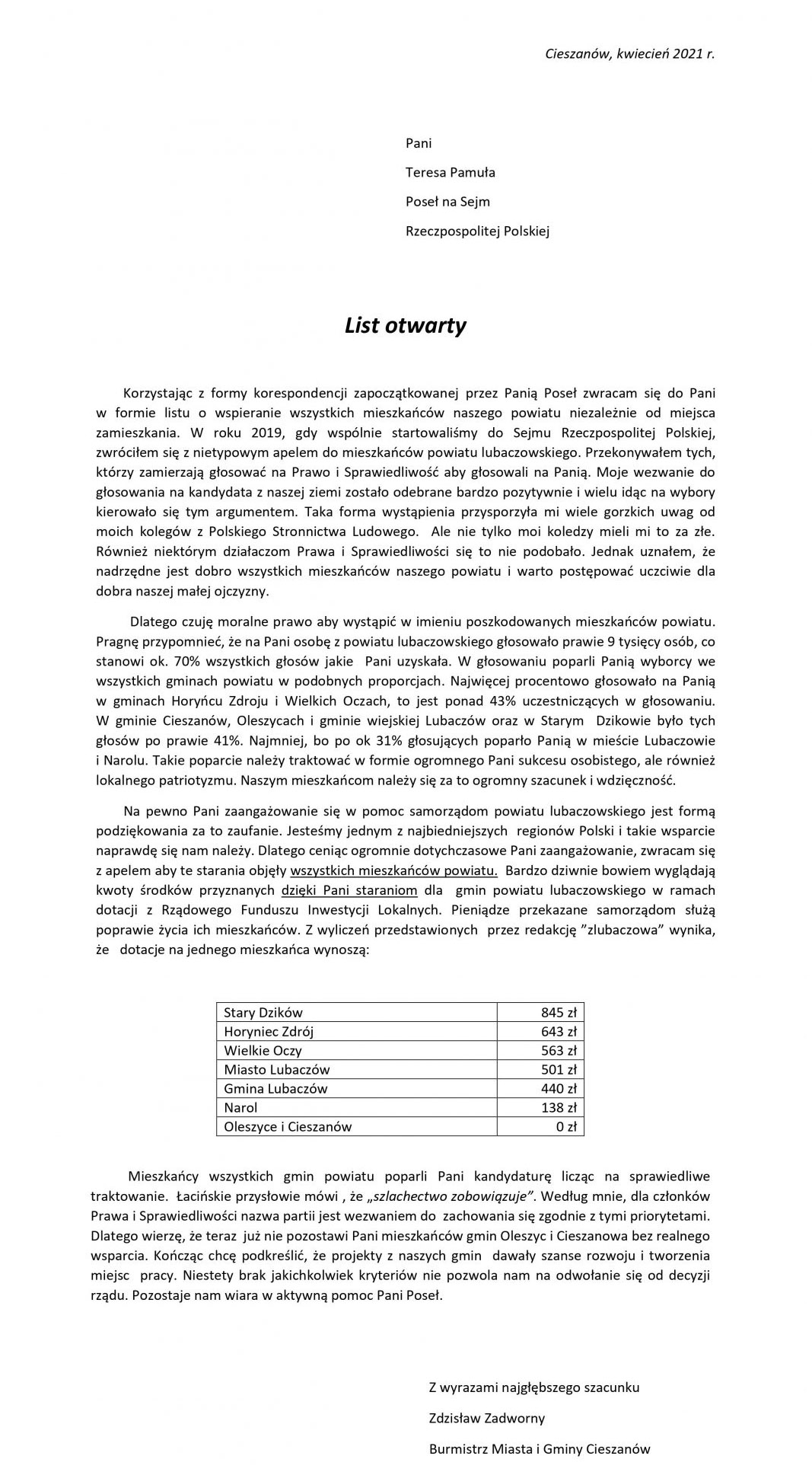 Najważniejsze jednak jest zawarte w kolejnym akapicie. Zdzisław Zadworny zaapelował do poseł o starania na rzecz wszystkich mieszkańców powiatu lubaczowskiego, bo jak twierdzi "Bardzo dziwnie bowiem wyglądają kwoty środków przyznanych dzięki staraniom Teresy Pamuły dla gmin powiatu lubaczowskiego w ramach dotacji z Rządowego Funduszu Inwestycji Lokalnych"