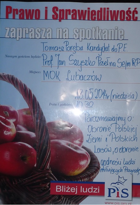 Kandydat do Europarlamentu z ramienia Prawa i Sprawiedliwości Tomasz Poręba oraz Poseł Jan Szyszko w najbliższą niedzielę (18.05) o godzinie 10:30 w Miejskim Domu Kultury spotkają się z mieszkańcami Lubaczowa i okolic.