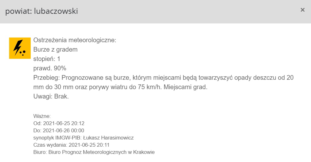 Przebieg: Prognozowane są burze, którym miejscami będą towarzyszyć opady deszczu od 20 mm do 30 mm oraz porywy wiatru do 75 km/h. Miejscami grad. - przewidują synoptycy z Biura Prognoz Meteorologicznych w Krakowie.