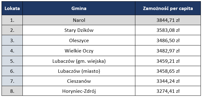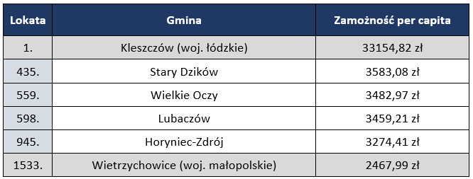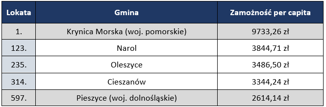 Od kilkunastu lat magazyn „Wspólnota” przygotowuje rankingi finansowe, m.in. dotyczące wydatków na inwestycje i poziomu zamożności w przeliczeniu na jednego mieszkańca. Dochody poszczególnych samorządów w roku 2020, podobnie jak w latach wcześniejszych, zostały podzielone przez liczbę mieszkańców gminy.