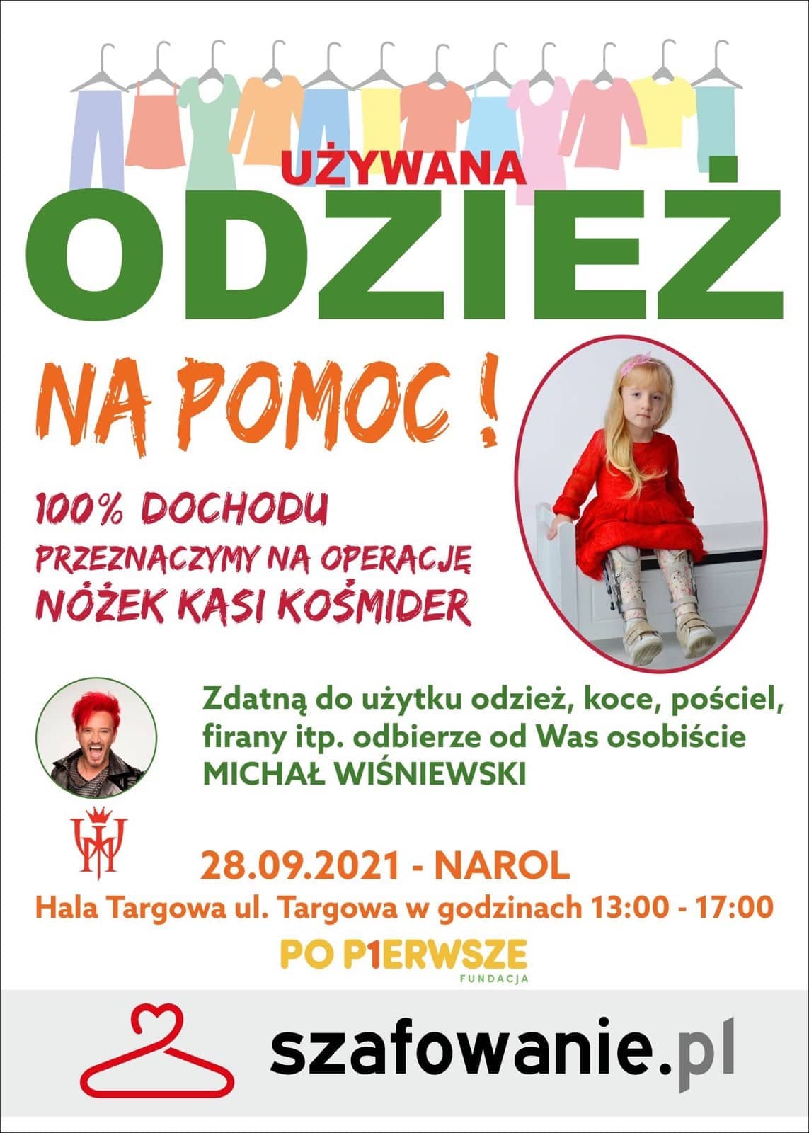 Kasia Kośmider to 6-letnia dziewczynka z Będzina, która urodziła się z bardzo rzadką chorobą genetyczną – dysplazją diastroficzną. Dziewczynka przeszła już 9 operacji, ale są potrzebne kolejne. Dlatego też w Narolu 28 września odbędzie się specjalna akcja zbiórki ubrań, kocy, pościeli czy firanek. Odbierze je sam Michał Wiśniewski.