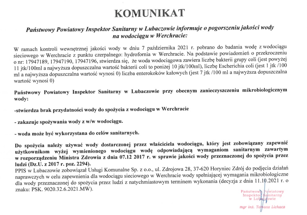 W związku z powyższym sanepid stwierdził brak przydatności wody do spożycia z wodociągu w Werchracie i zakazuje jej spożywania. Woda może być wykorzystywana do celów sanitarnych.