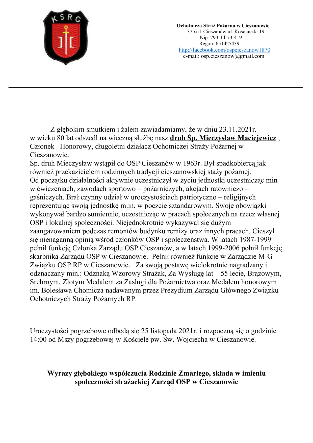 Ochotnicza Straż Pożarna w Cieszanowie poinformowała, że w dniu 23.11.2021 r. w wieku 80 lat na wieczną służbę odszedł druh Mieczysław Maciejewicz, Członek Honorowy, długoletni działacz tamtejszej OSP.