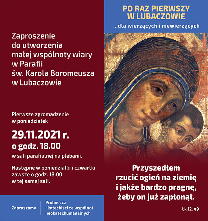 Proboszcz parafii św. Karola Boromeusza oraz katechiści ze wspólnot neokatechumenalnych zapraszają do utworzenia małej wspólnoty wiary. Pierwsze zgromadzenie odbędzie się w poniedziałek.