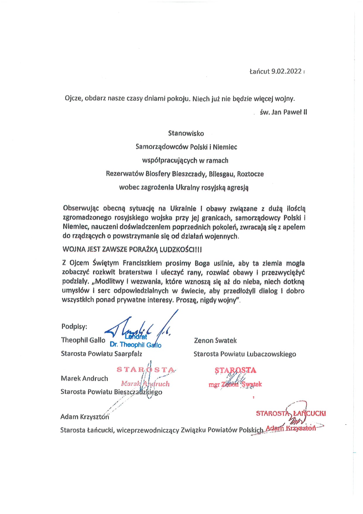 Starostowie powiatów: bieszczadzkiego, lubaczowskiego, łańcuckiego oraz niemieckiego Saarpfal wystosowali stanowisko wobec zagrożenia Ukrainy rosyjską agresją.