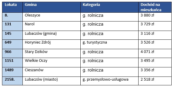 Jeśli chodzi o powiat lubaczowski, największe uznanie należy się władzom gminy Oleszyce, ponieważ znalazła się ona na 8. miejscu wśród wszystkich gmin w Polsce, a także 4 miejsce wśród gmin rolniczych o dochodach budżetowych powyżej 3300 zł/ osobę. Dochód na jednego mieszkańca gminy Oleszyce został obliczony na 3880 zł. Oprócz świetnego miejsca w ogólnopolskim rankingu gmina powiatu lubaczowskiego zajęła również pierwsze miejsce w województwie podkarpackim i wyprzedziła między innymi takie miasta jak Rzeszów czy Przemyśl. Dobrą pracą mogą się także pochwalić rządzący w gminach Narol i Lubaczów. Gmina na skraju województwa lubelskiego zajęła 131 miejsce, wyliczono także że średni dochód na mieszkańca wyniósł 3729 zł. Jeżeli chodzi o gminę Lubaczów to uplasowała się ona na również dobrym - 145 miejscu. Słabo wypadło miasto Lubaczów, jedyna gmina z kategorii przemysłowo-usługowej. No cóż, Lubaczowa do gmin rolniczych przydzielić nie można było, a przemysłu u nas zbyt dużo nie ma, dlatego też miejsce w rankingu wymarzone nie jest – dopiero 2158. Dochód na mieszkańca najniższy w całym powiecie 2158 zł.